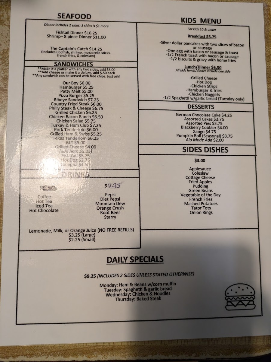 “ If rating based on the food alone, it would be 4 stars. The fried chicken we got was unusually dark in color, and tasted like it had been made earlier in the morning and then simply warmed up when served. However, what makes up for the rating is the exceptional service. Our server, KC, was bubbly, friendly, and super accommodating. We were treated like locals even though it was pretty clear we were new to the place. She never made us feel out of place and really contributed to the small-town, mom-and-pop shop vibe we were looking for. Although we found the taste average, the portions are huge. The country style dinners come with 3 sides and a piece of bread, for only $9 ($8.50 if you’re 55 and above). ”