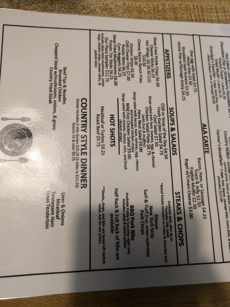 “ May 2022 Edit, sadly, the past two times we have tried chicken there it was really dry, and the breast was oddly cut down the center, and tough. We will order something else next time. Our Place is family owned, and the chicken is amazing! Youre looking at typical old fashioned diner type food. The sides are the same as you would've gotten in the 70s from a Woolworth lunch counter. It's worth the trip if you love chicken, ribs or a good steak. Grab a jar of cinnamon hard tack candy...grandma really did make it. Cost of four pieces of broasted chicken and three sides....$8.95. ”